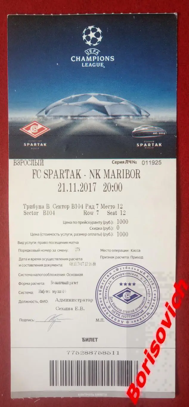 Билет ФК Спартак Москва - ФК Марибор Марибор Словения 21-11-2017