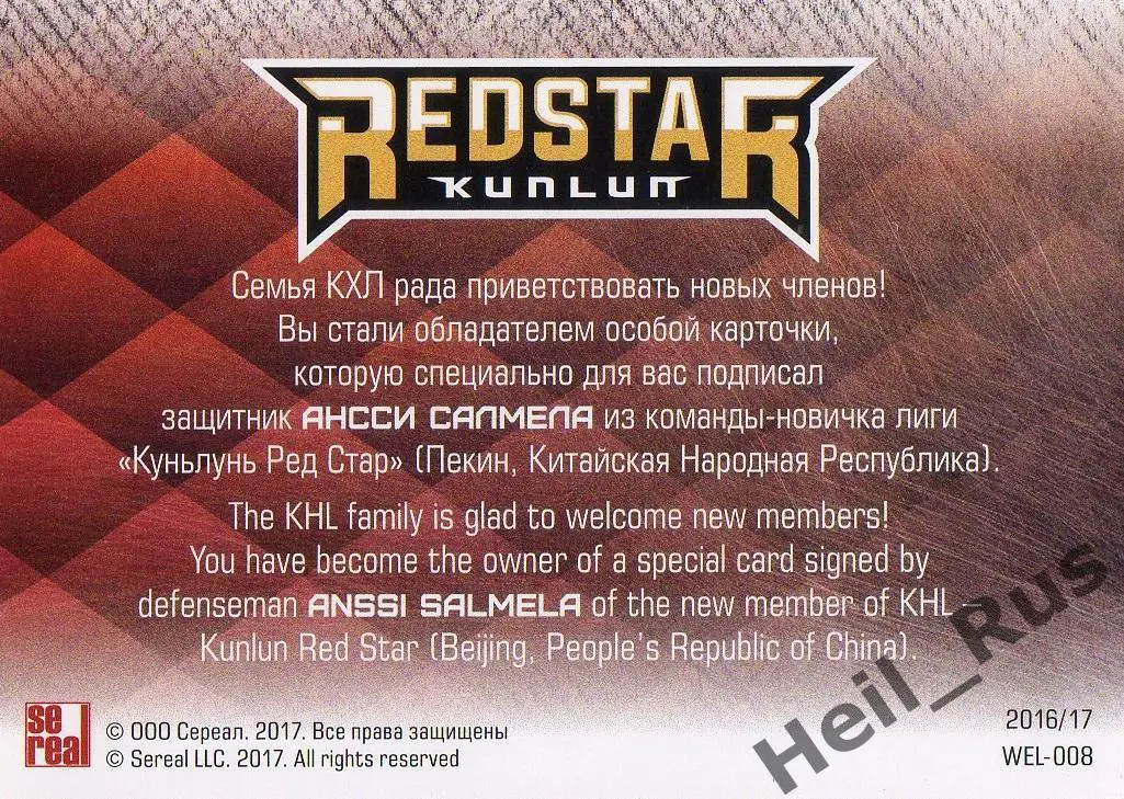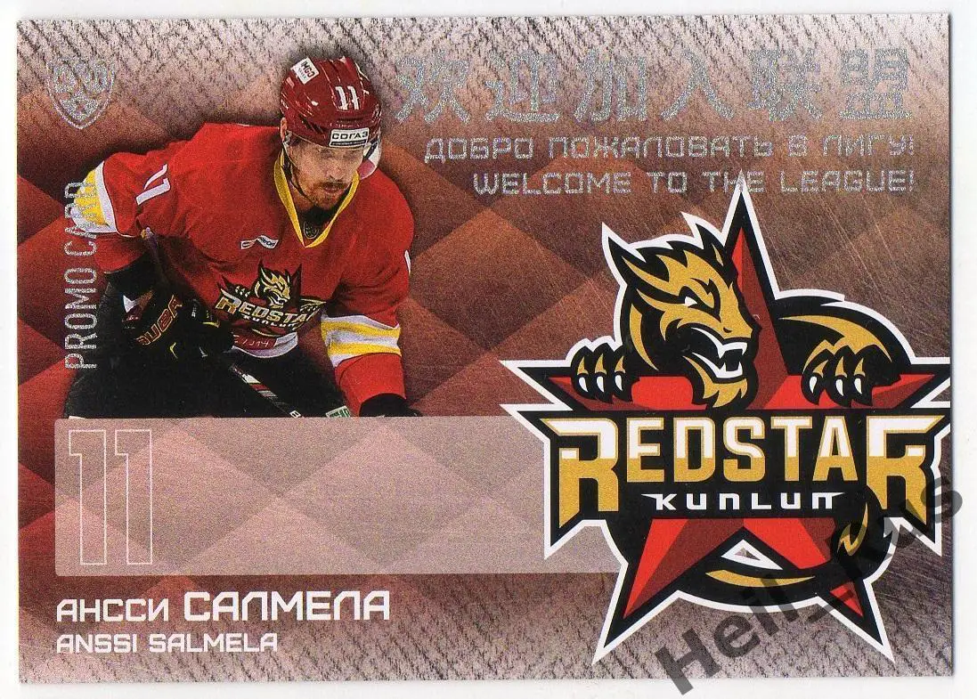 Хоккей. Карточка для автографа Ансси Салмела Куньлунь Ред Стар Пекин КХЛ 2016/17