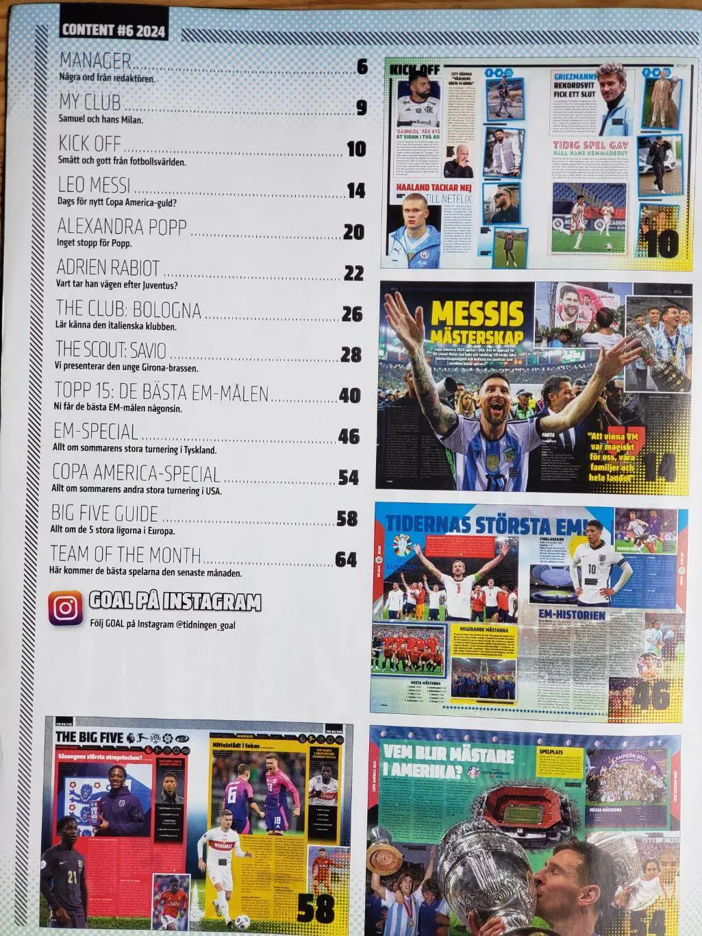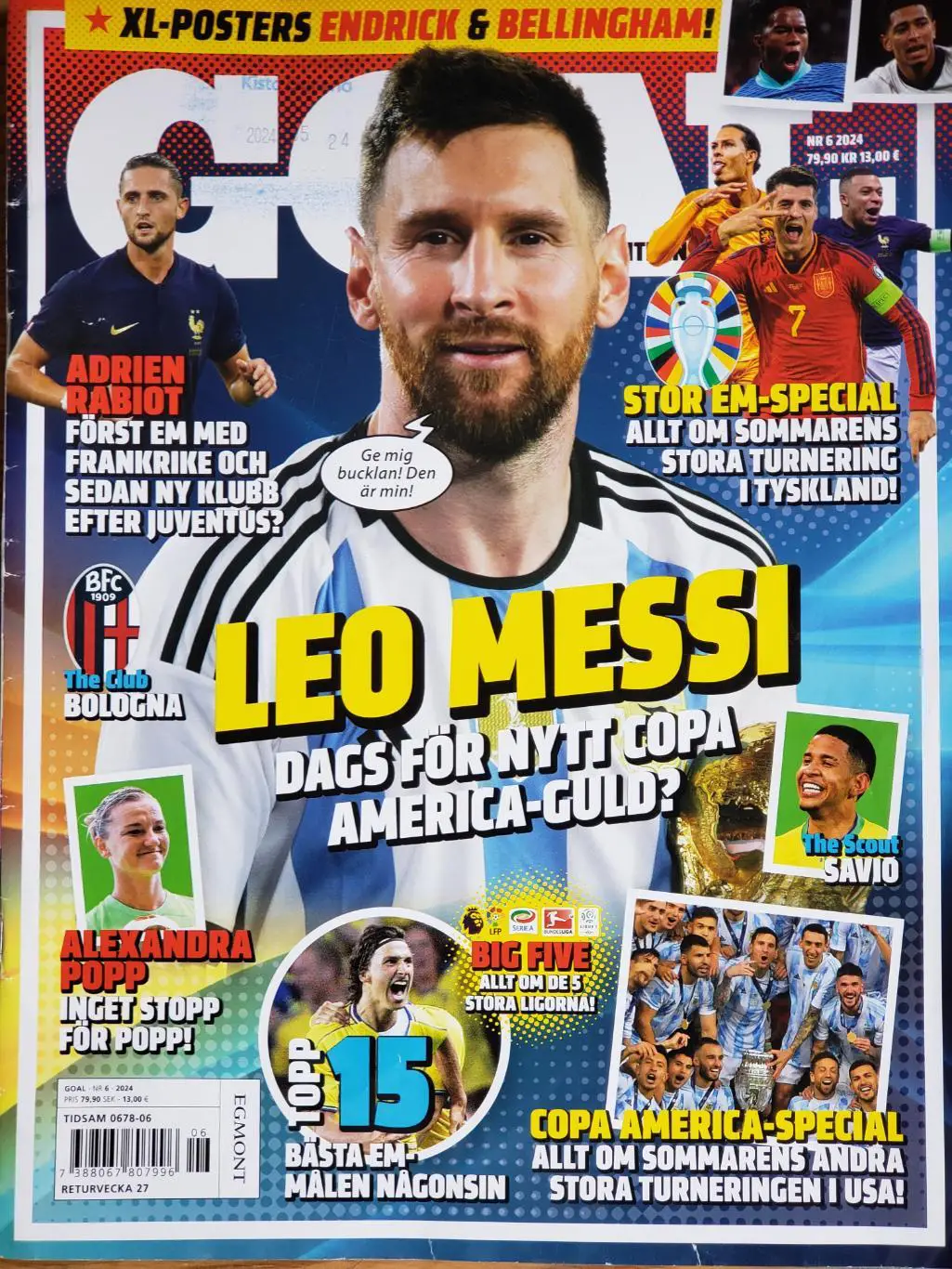В журнале много фотографий разного формата, 66 стр. На обложке и 2 фото содержание. В журнале фото и статьи Милан, .Болонья, Месси, сборная Бразилии чемпион Копа Америка 2024, сборная Испании. Много всего о ЧЕ-2024. Также 3 двухстороних постера. Два размером как 2 листа А-4 каждый. Первый - Расмус Хойлунд и Флориан Виртц. Второй- Мбаппе и Лаутаро Мартинез..Третий --Рафинья и Килиан Мбаппе, достаточно большой 45×58. Все постеры на фото. Большой постер на 2 стр фото фрагмента финала 1 ЧЕ СССР- Югославия 2:1 .