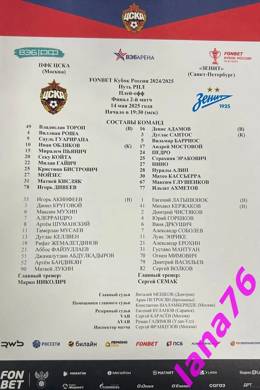 Кубок ЦСКА Москва - Зенит Санкт-Петербург 14.05.2025 официальная программа+стартКубок ЦСКА Москва - Зенит Санкт-Петербург 14.05.2025 официальная программа+старт 1