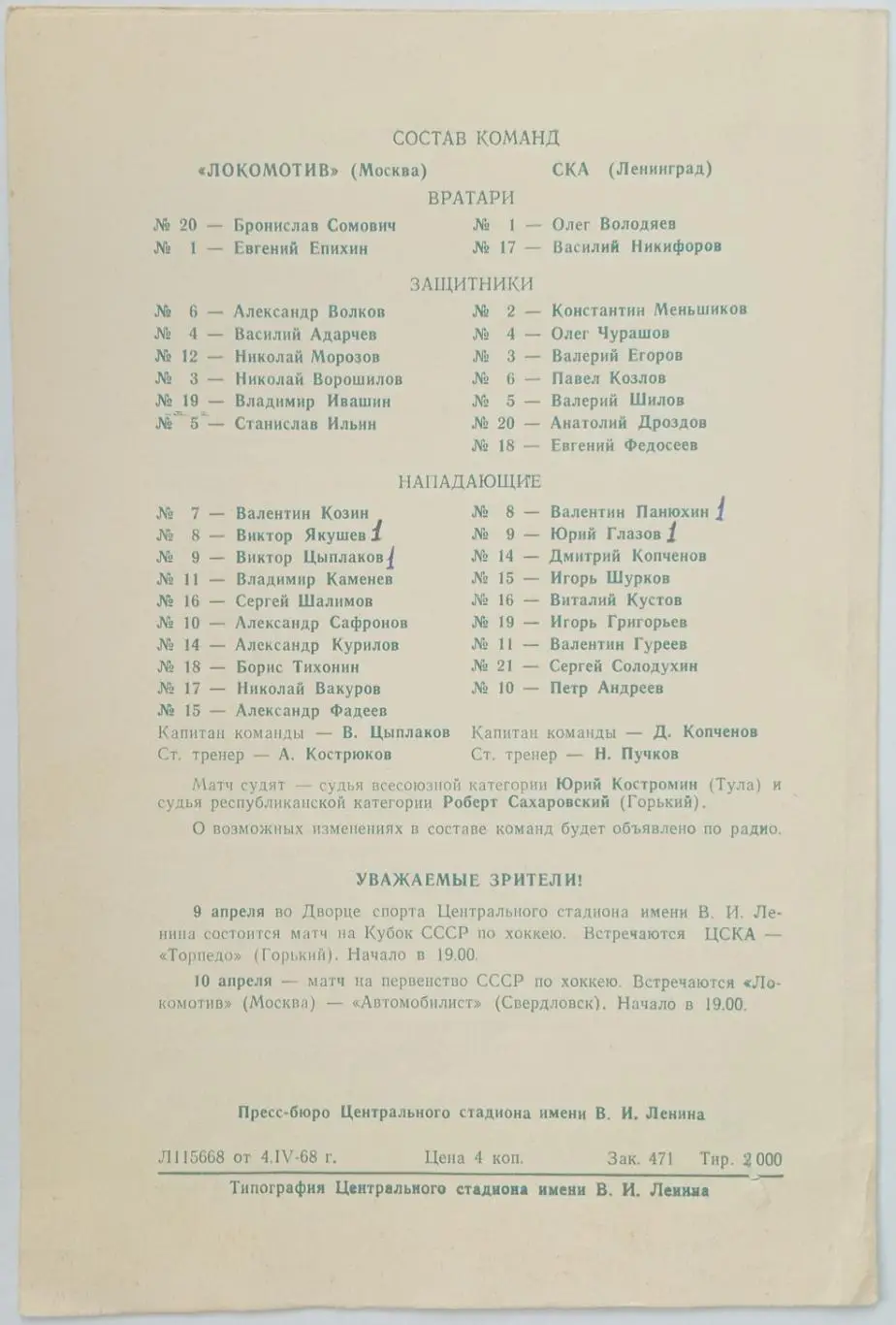Локомотив Москва – СКА Ленинград 07.04.1968 Кубок СССР ПолуфиналЛокомотив Москва – СКА Ленинград 07.04.1968 Кубок СССР Полуфинал 1