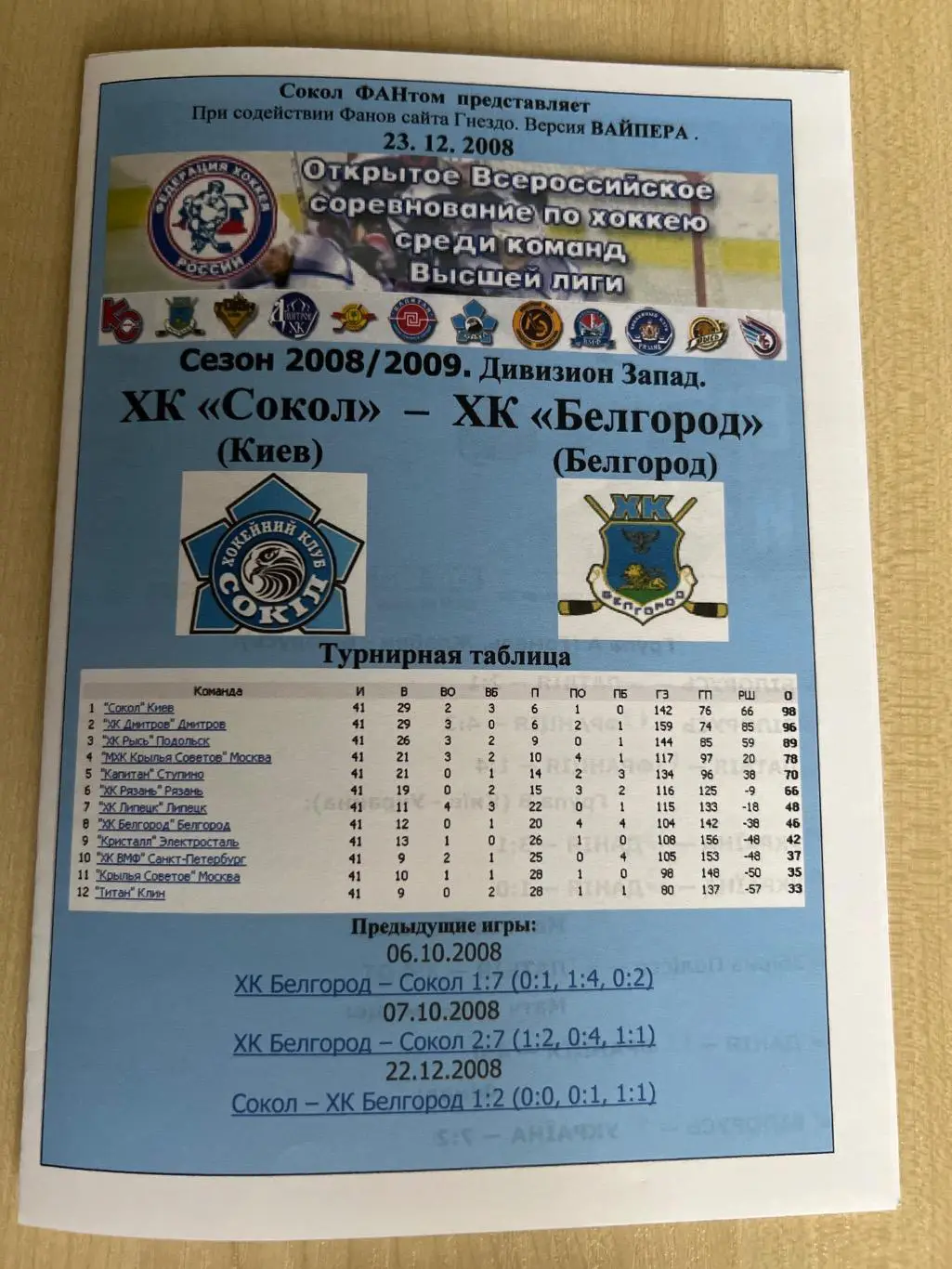 Хоккей. Сокол Киев - ХК Белгород 2008-2009