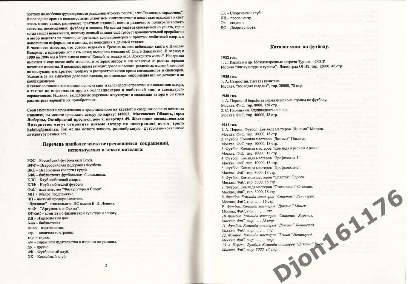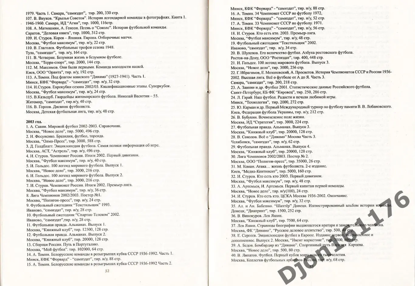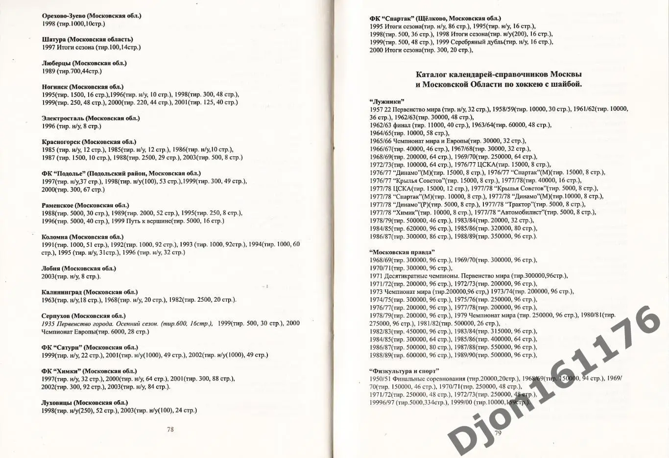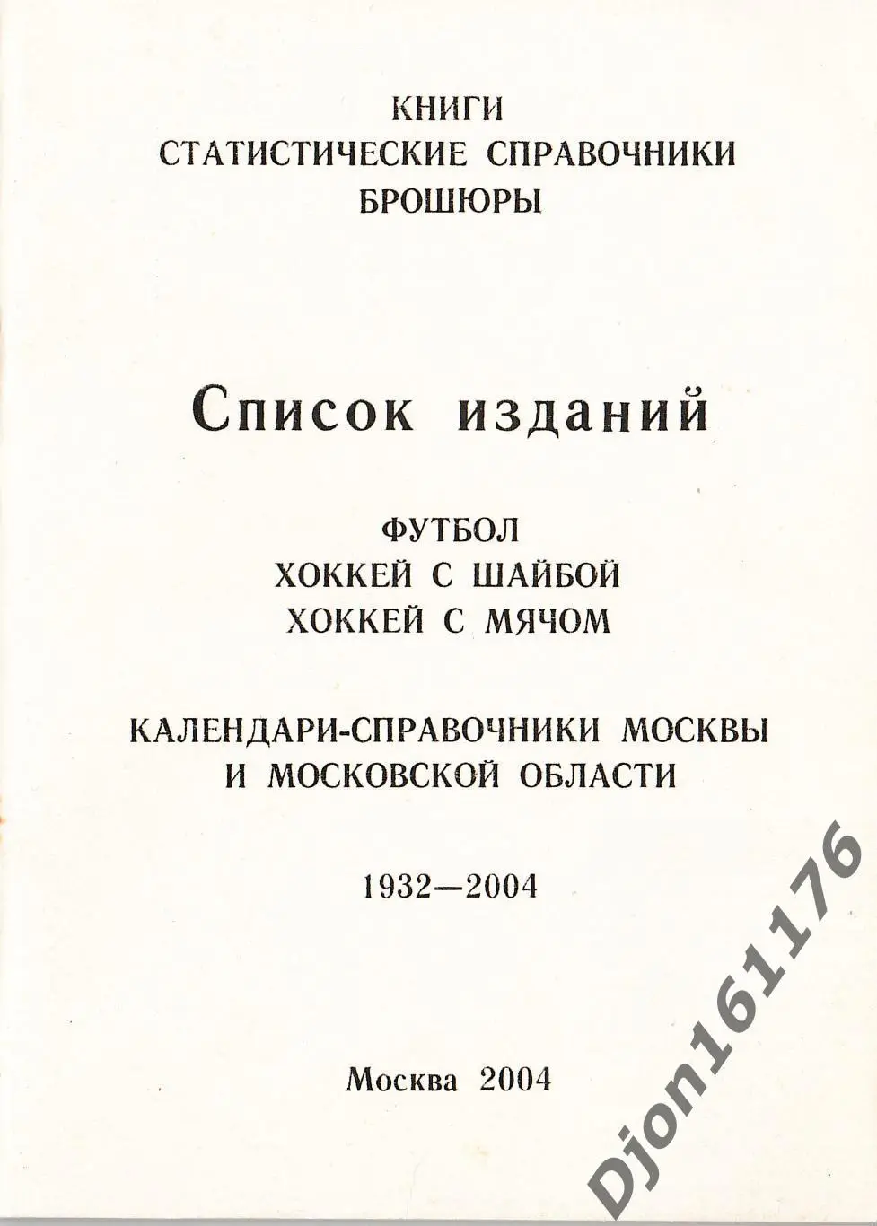 «Книги. Статистические справочники. Брошюры. Список изданий. Футбол. Хоккей с шайбой. Хоккей с мячом. Календари-справочники Москвы и Московской области 1932-2004». Автор-составитель А.М.Серебренников. Москва. Люберцы. 2004 год. 100 экз. 84 стр.