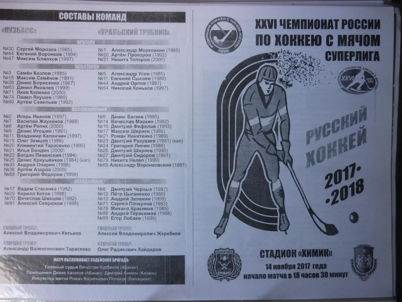 Кузбасс(Кемерово) - Уральский трубник(Первоуральск) - 2017/18 - официальная программа