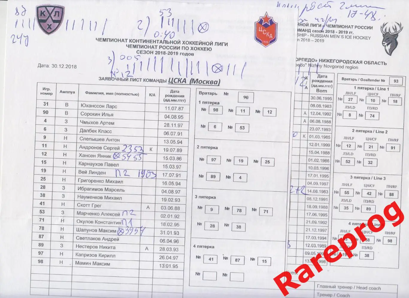 протокол - ЦСКА Москва - Торпедо Нижний Новгород - 30.12 2018
