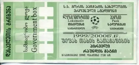 білет Локо.Тб/Lokomotiv Tbilisi Georgia-ПАОК/PAOK Greece/Грец.1999а match ticket
