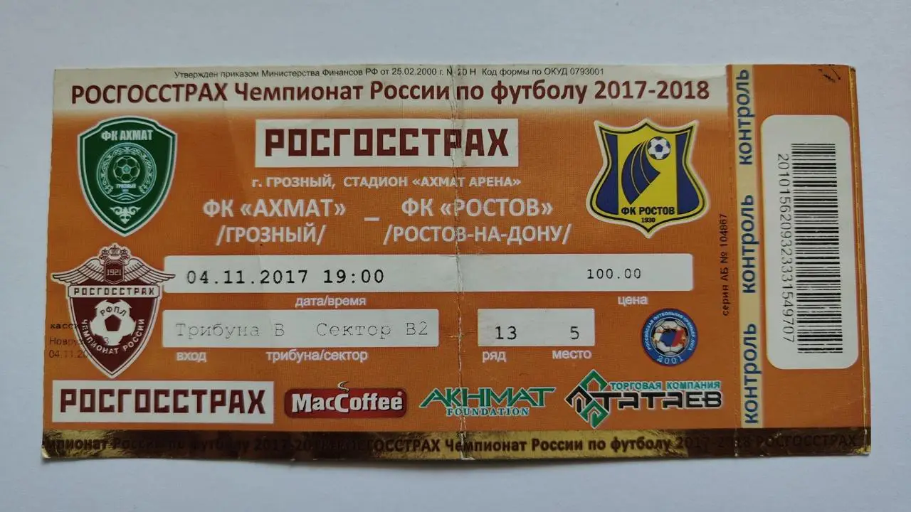 Билет. Ахмат Грозный - ФК Ростов 4 ноября 2017