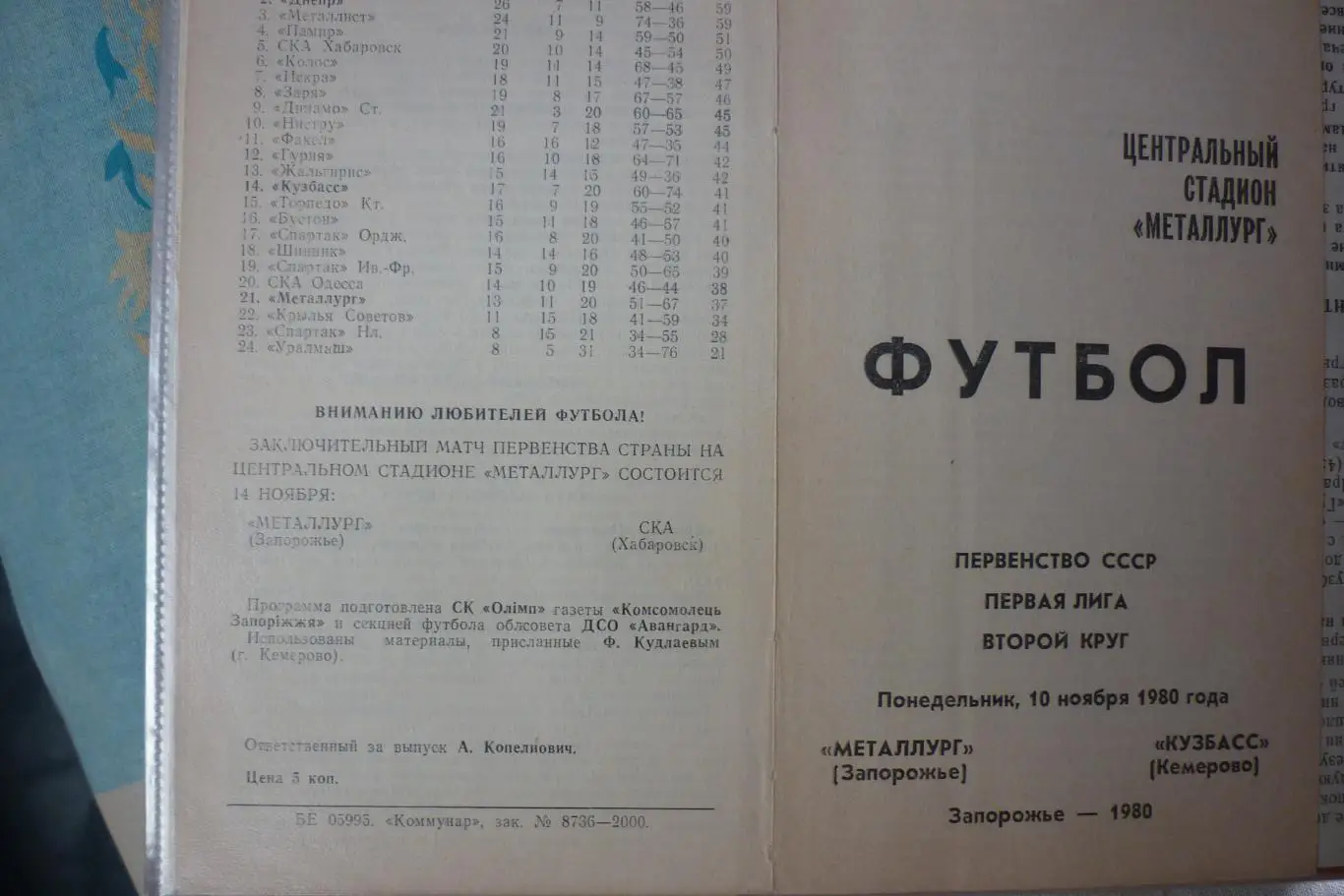 Металлург(Запорожье) - Кузбасс(Кемерово) - 1980 - официальная программа