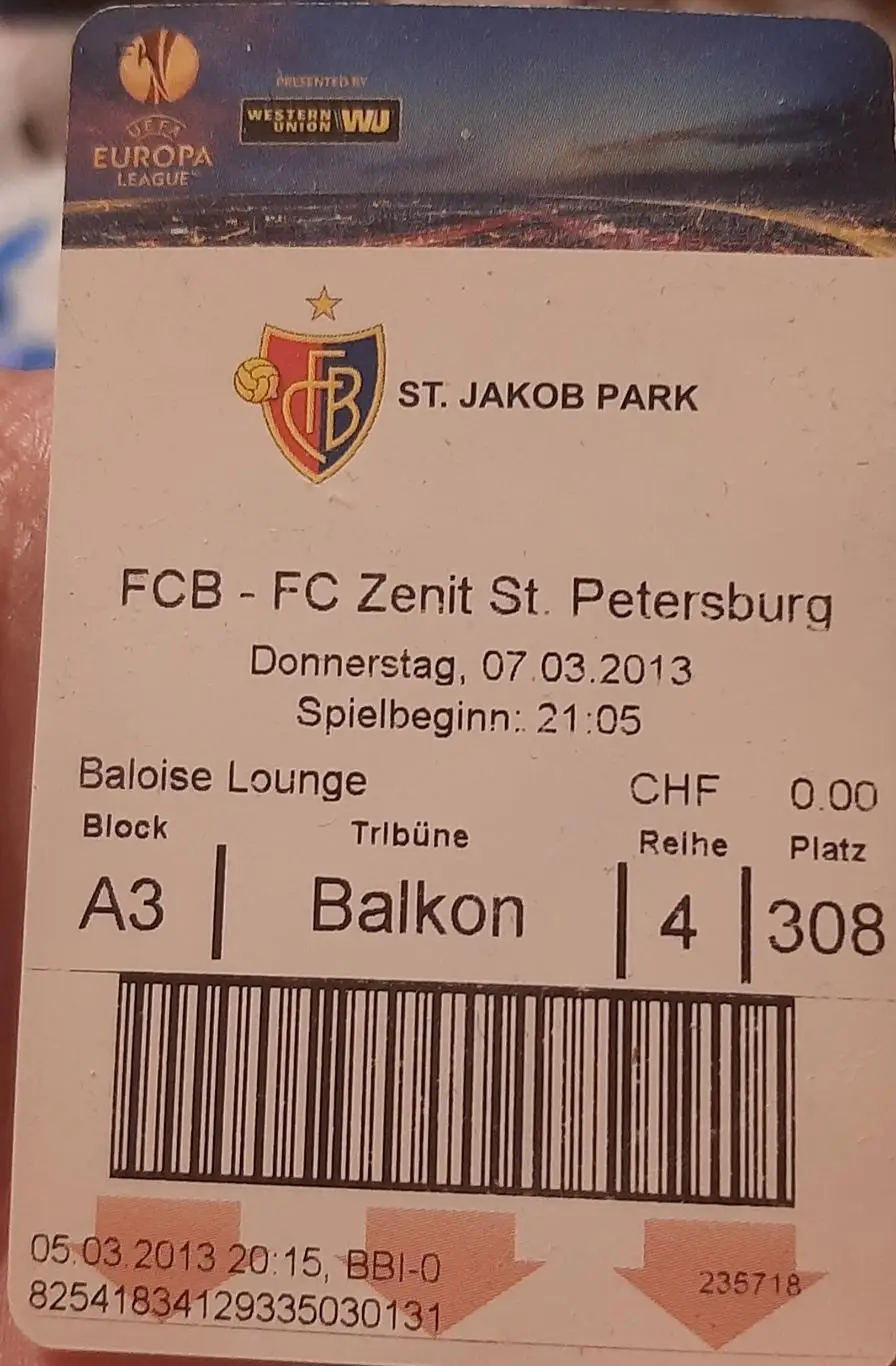 Базель Швейцария — Зенит Санкт-Петербург Россия 07.03.2013. Билет к матчу