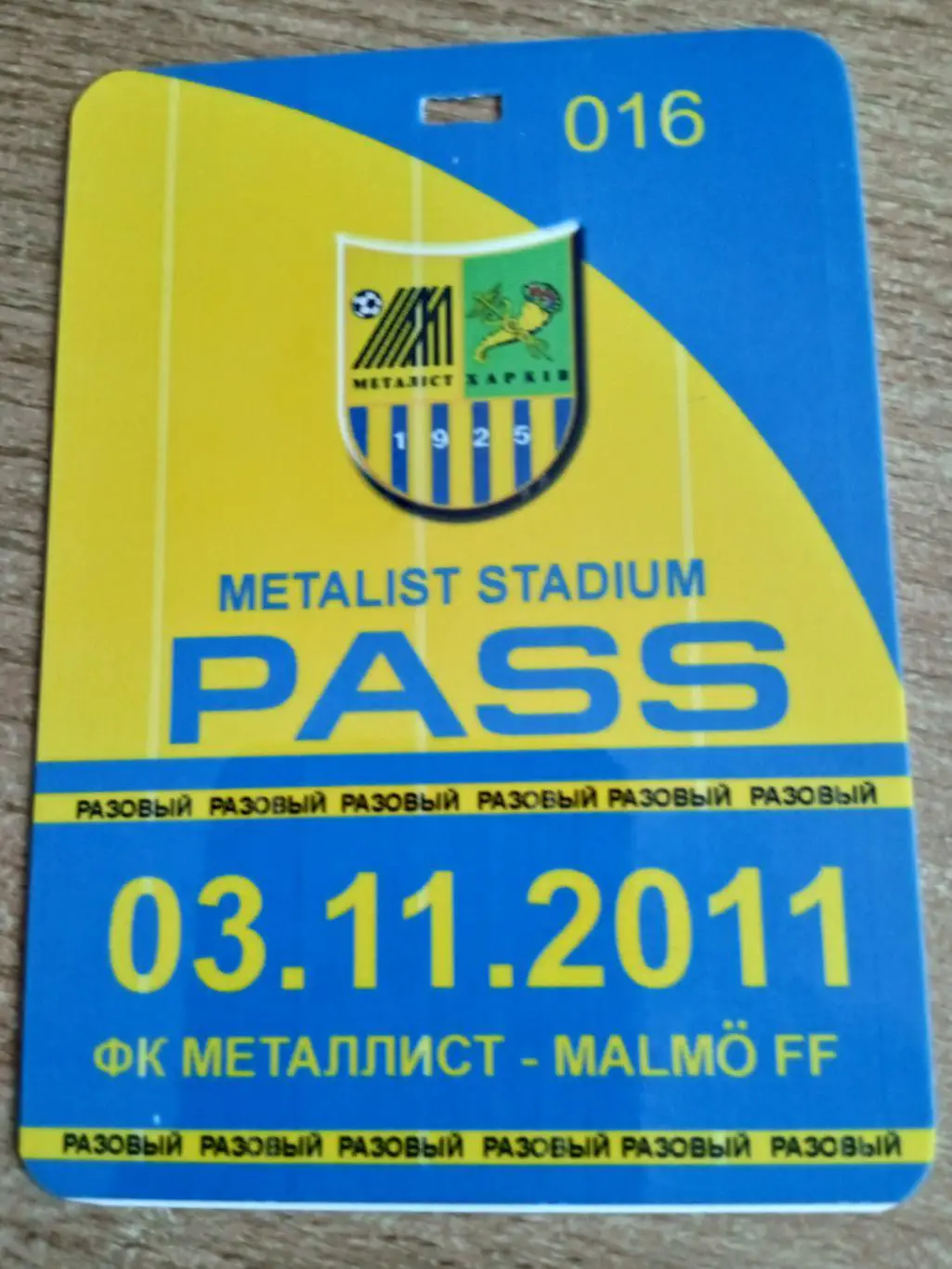 .билет(пропуск).Металлист Харьков-Мальме Швеция-3.11. 2011