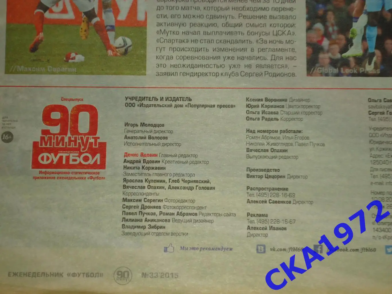 газета 90 минут №33 2015 Приложение еженедельника Футбол