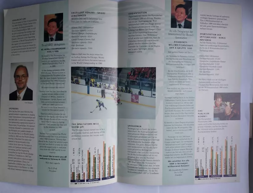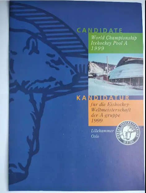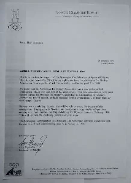 Хоккей. Официальная программа представления кандидата Норвегии на организацию и проведения чемпионата Мира по хоккею 1999 года + официальное письмо заявка от НОК Норвегии к IIHF 20.09.1994 года.