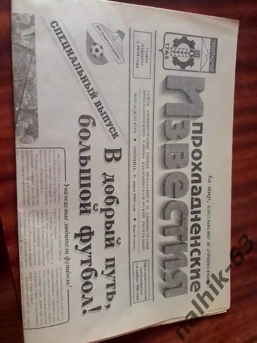 Прохладненские Известия. Футбольный спецвыпуск Спецвыпуск от 31 марта 2000 года