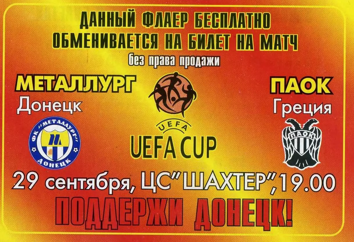 Металлург Донецк - ПАОК Греция 2005 Кубок УЕФА - флаер