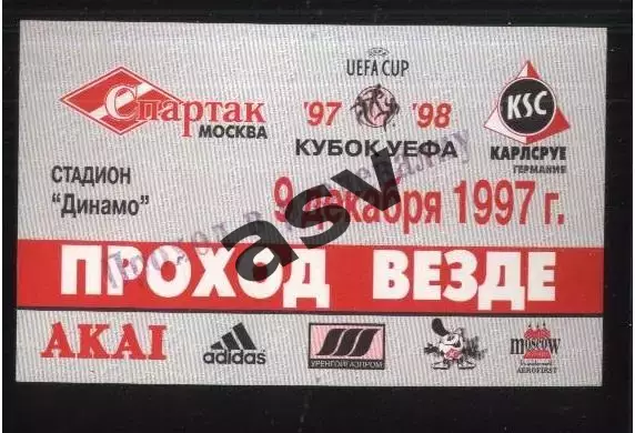 Спартак Москва – Карлсруе / Карлсруэ — 09.12.1997 К.УЕФА Аккредитация ВездеходСпартак Москва – Карлсруе / Карлсруэ — 09.12.1997 К.УЕФА Аккредитация Вездеход 1