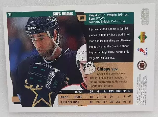 карточка хоккей НХЛ Грег Адамс Даллас Старз № 71 выпуск 1997-98 Upper Deck Collector's Choice Hockey