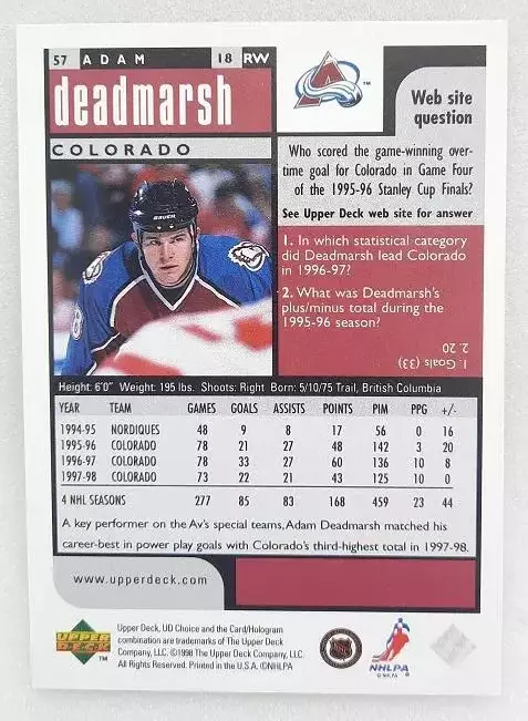 карточка хоккей НХЛ Адам Дэдмарш Колорадо Эвеланш № 57 выпуск 1998-99 Upper Deck Choice Hockey