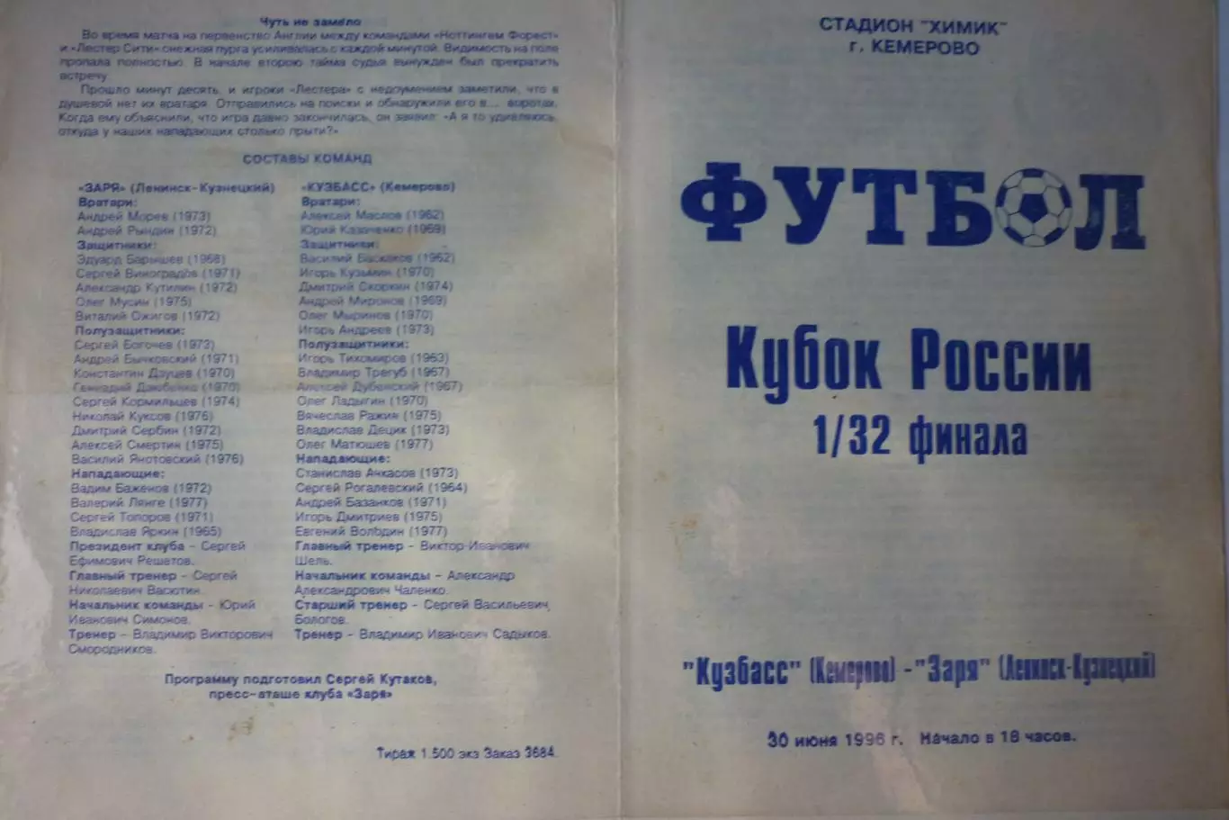 Кузбасс(Кемерово) - Заря(Ленинск-Кузнецкий) - 1996 - официальная программа Кубка России