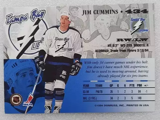 карточка хоккей НХЛ Джим Камминс Тампа Бэй Лайтнинг № 434 выпуск 1994-95 Leaf Hockey, состояние на фото