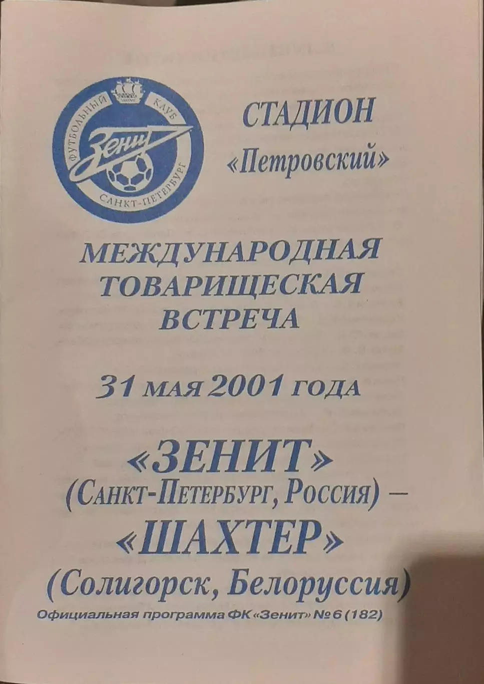 Зенит Санкт-Петербург — Шахтёр Солигорск 31.05.2001. Официальная программа