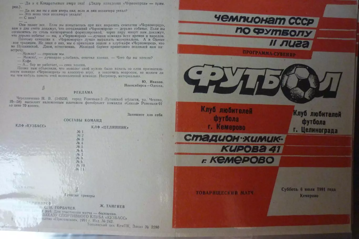 КЛФ города Кемерово - КЛФ города Целиноград - 1991 - официальная программа товарищеского матча