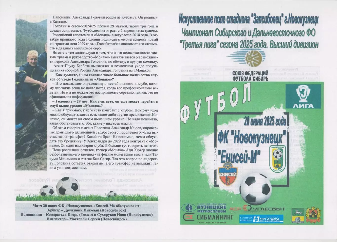 ФК Новокузнецк(Новокузнецк) - Енисей-М(Красноярск) - 2025 - официальная программа, 8 стр.