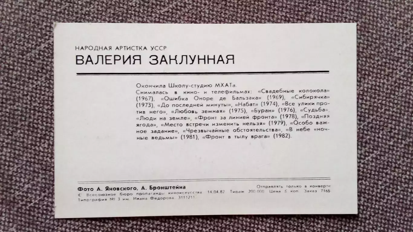 Актеры и актрисы кино и театра СССР : Валерия Заклунная 1982 г. Артисты СССР