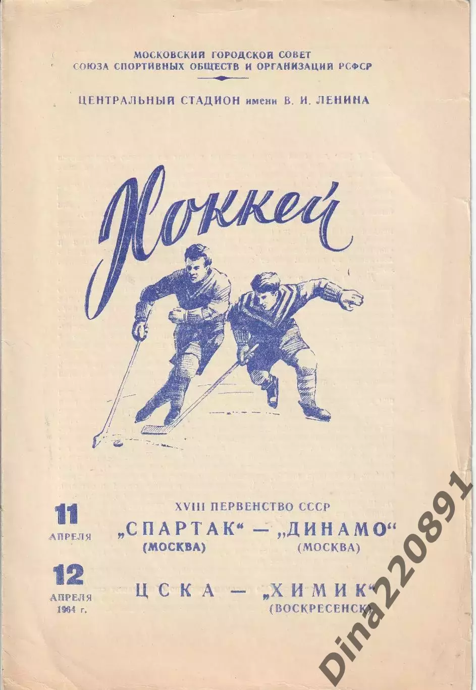 Хоккей Спартак Москва - Динамо Москва,ЦСКА - Химик 11-12.04.1964 Первенство СССР. официальная программа.