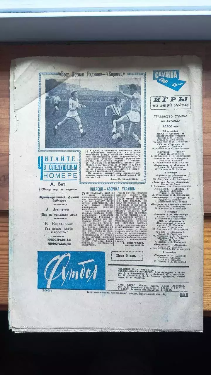 Еженедельник Футбол-Хоккей 1966, № 36, часть текста на обложке зеленого цвета.