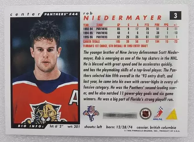 карточка хоккей НХЛ Роб Нидермайер Флорида Пантерз № 3, выпуск 1996-97 Score Hockey, состояние на фото