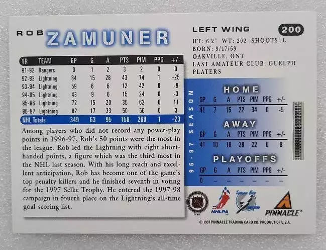карточка хоккей НХЛ Роб Замунер Тампа Бэй Лайтнинг № 200 выпуск 1997-98 Score Hockey с