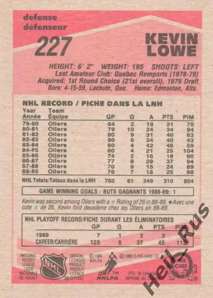 Хоккей Карточка Kevin Lowe / Кевин Лоу (Edmonton Oilers/Эдмонтон Ойлерз) НХЛ/NHL
