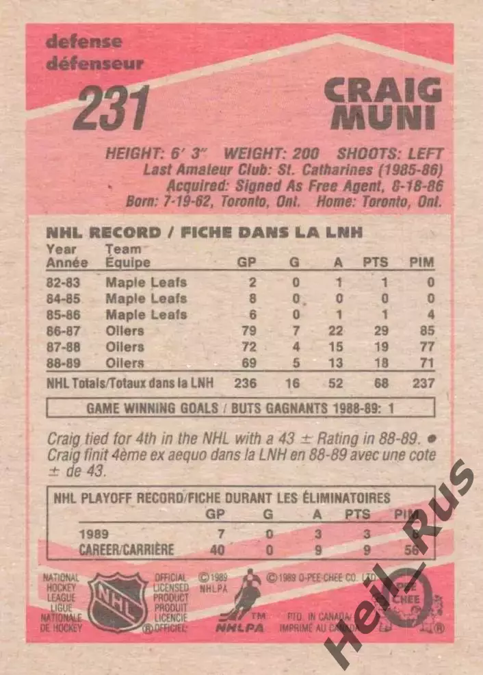 Хоккей. Карточка Craig Muni/Крейг Муни (Edmonton Oilers/Эдмонтон Ойлерз) NHL/НХЛ