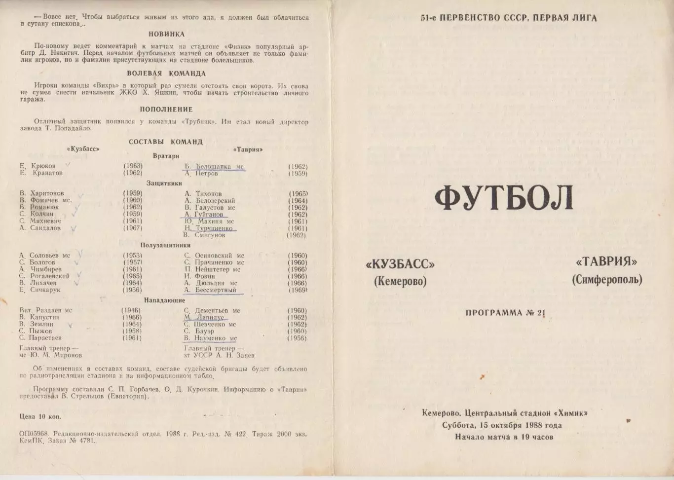 Кузбасс(Кемерово) - Таврия(Симферополь) - 1988 - официальная программа