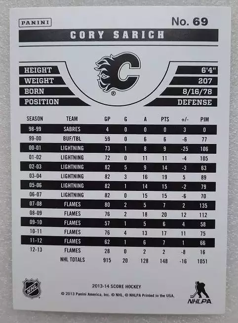 карточка хоккей НХЛ Кори Сарич Калгари Флэймз № 69, выпуск 2013-14 Panini Score Hockey, состояние на фото