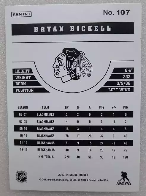 карточка хоккей НХЛ Брайан Бикелл Чикаго Блэкхокс № 107, выпуск 2013-14 Panini Score Hockey, состояние на фото
