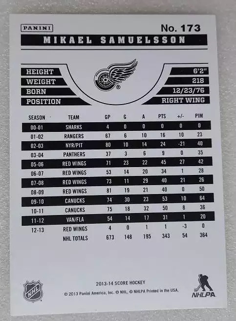 карточка хоккей НХЛ Микаэль Самуэльссон Детройт Ред Уингз № 173, выпуск 2013-14 Panini Score Hockey, состояние на фото