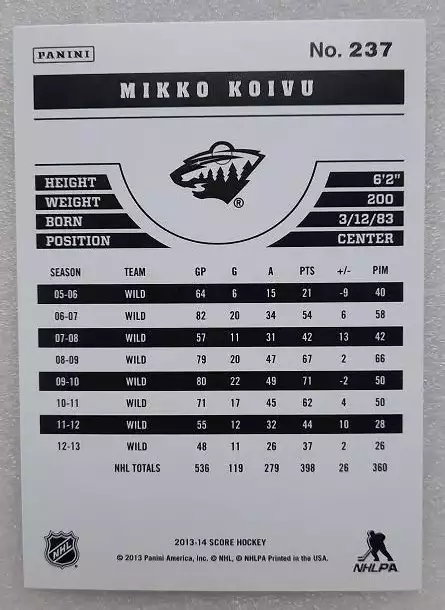 карточка хоккей НХЛ Микко Койву Миннесота Уайлд № 237, выпуск 2013-14 Panini Score Hockey, состояние на фото
