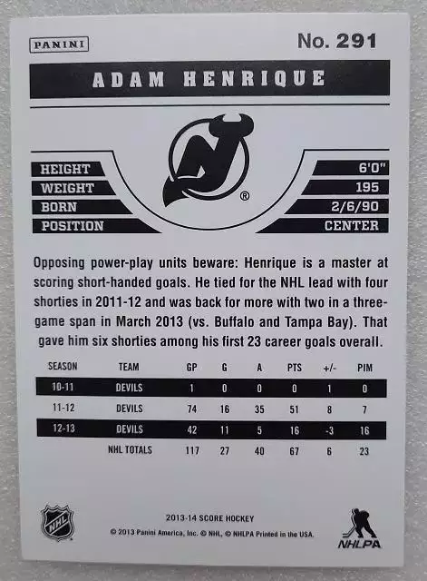 карточка хоккей НХЛ Адам Хенрик Нью-Джерси Дэвилз № 291, выпуск 2013-14 Panini Score Hockey, состояние на фото