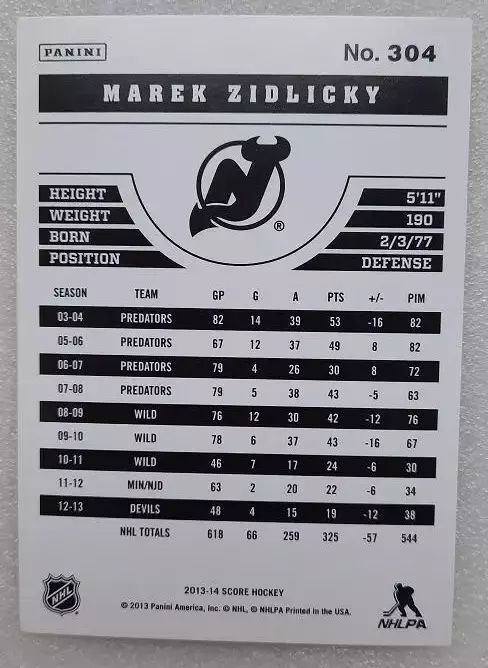 карточка хоккей НХЛ Марек Жидлицки Нью-Джерси Дэвилз № 304, выпуск 2013-14 Panini Score Hockey, состояние на фото