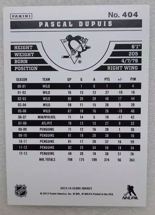 карточка хоккей НХЛ Паскаль Дюпюи Питтсбург Пингвинз № 404, выпуск 2013-14 Panini Score Hockey, состояние на фото
