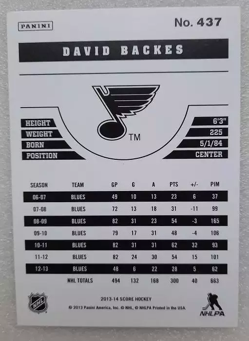 карточка хоккей НХЛ Дэвид Бэкес Сент-Луис Блюз № 437, выпуск 2013-14 Panini Score Hockey, состояние на фото