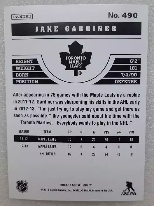 карточка хоккей НХЛ Джейк Гардинер Торонто Мэйпл Лифс № 490, выпуск 2013-14 Panini Score Hockey, состояние на фото
