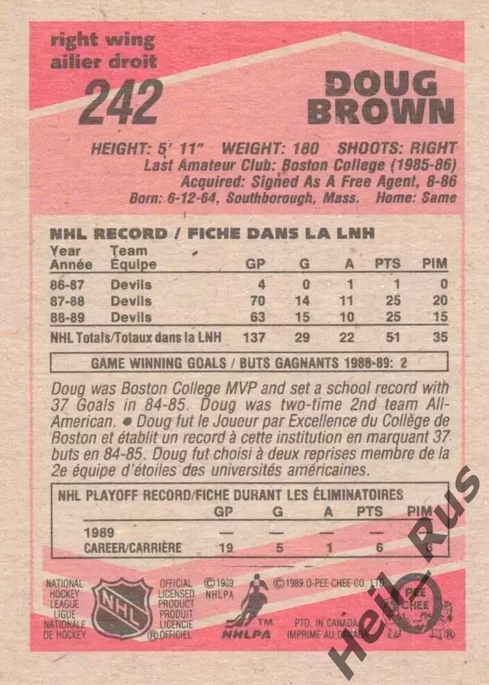 Хоккей Карточка Doug Brown/Дуг Браун New Jersey Devils/Нью-Джерси Девилз NHL НХЛ