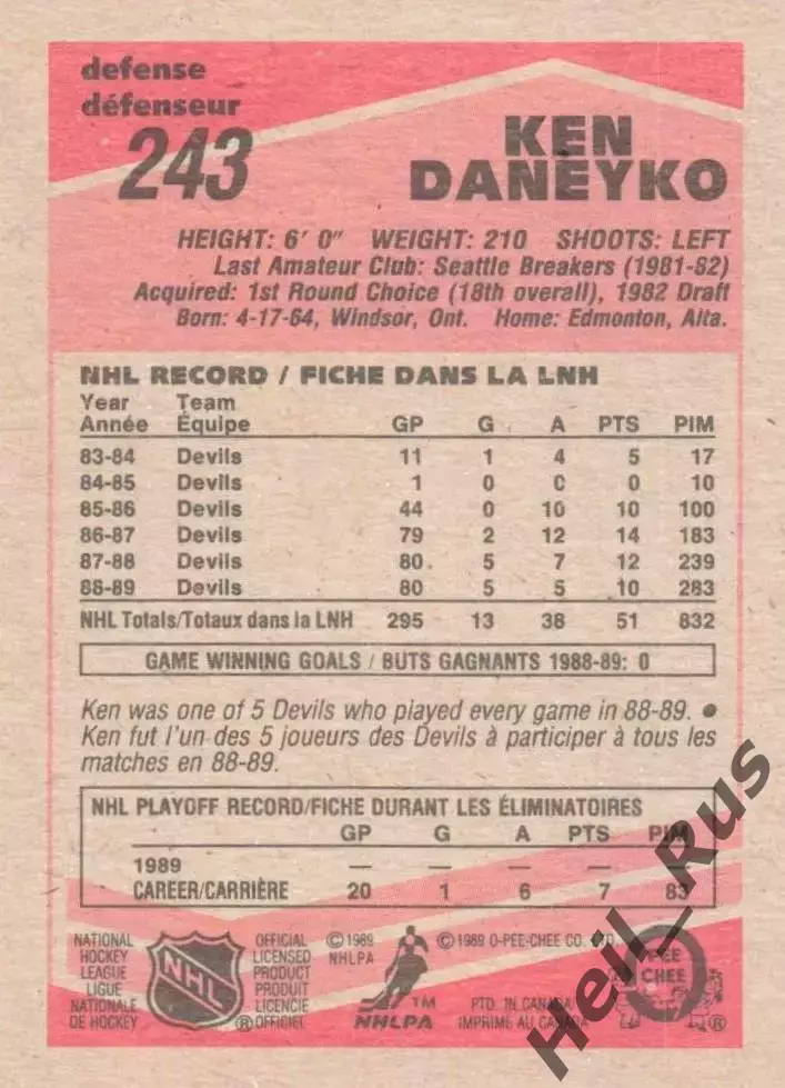 Карточка Ken Daneyko/Кен Данейко (New Jersey Devils/Нью-Джерси Девилз) НХЛ/NHL
