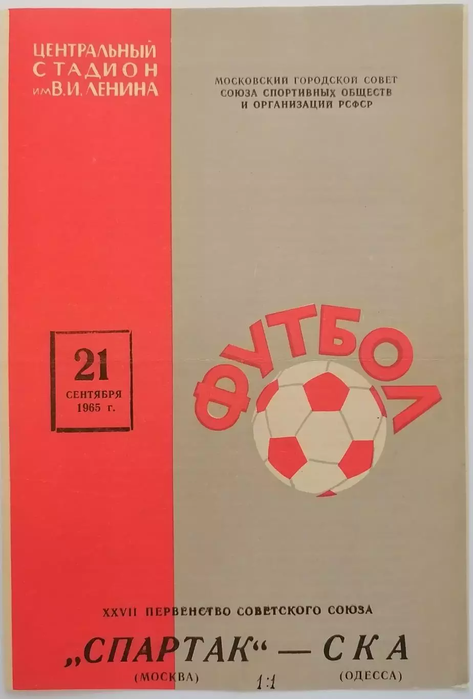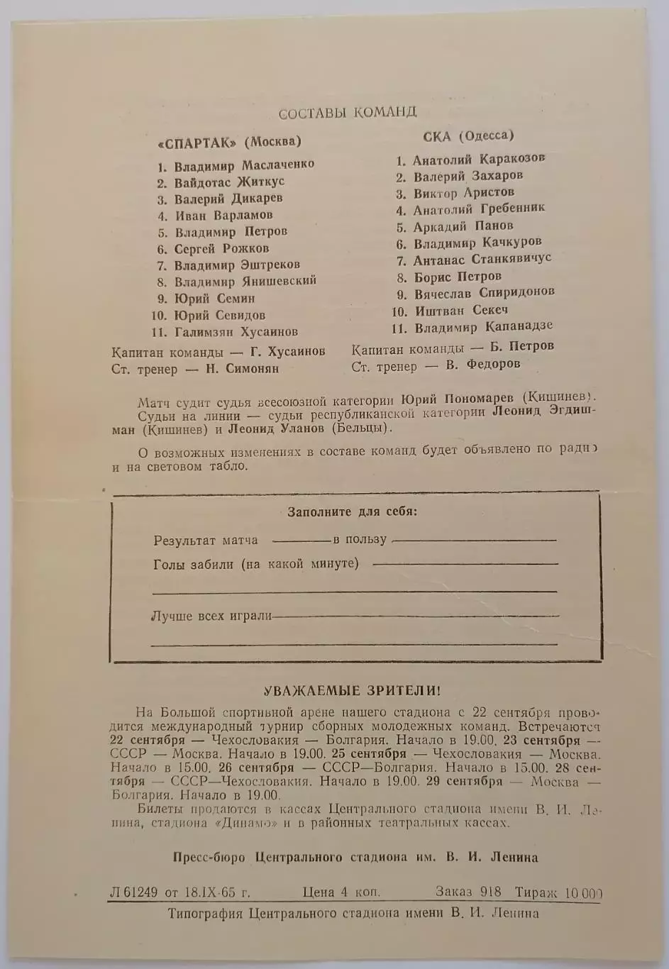 СПАРТАК МОСКВА - СКА ОДЕССА 1965 официальная программа 21.09.