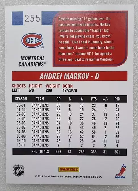 карточка хоккей НХЛ Андрей Марков Монреаль Канадиенс Воскресенск Динамо Москва Подольск № 255, выпуск 2011-12 Panini Score Hockey, состояние на фото