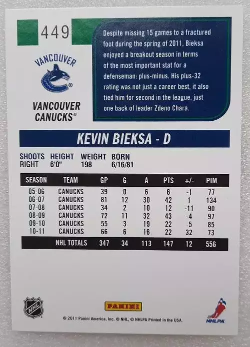 карточка хоккей НХЛ Кевин Биекса Ванкувер Кэнакс № 449, выпуск 2011-12 Panini Score Hockey, состояние на фото