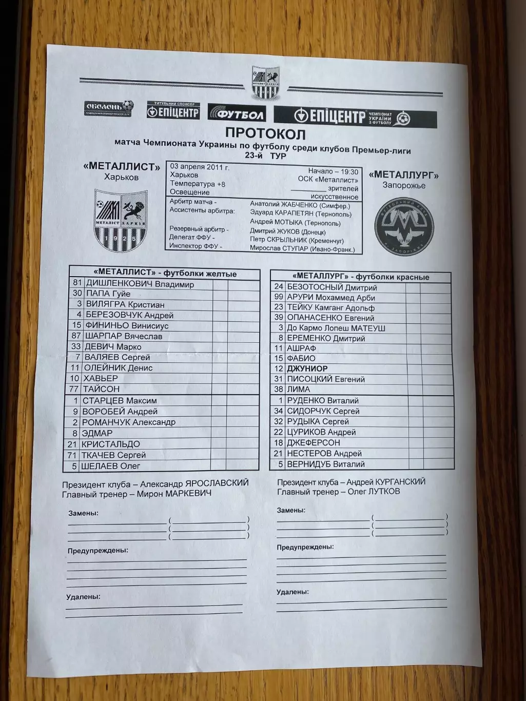 Протокол матчу. Металіст Харків- Металург Запоріжжя. 03.04.2011.м.