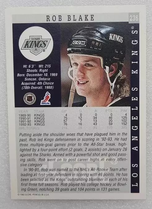 карточка хоккей НХЛ Роб Блейк Лос-Анжелес Кингз № 236 выпуск 1993-94 Score American Hockey с